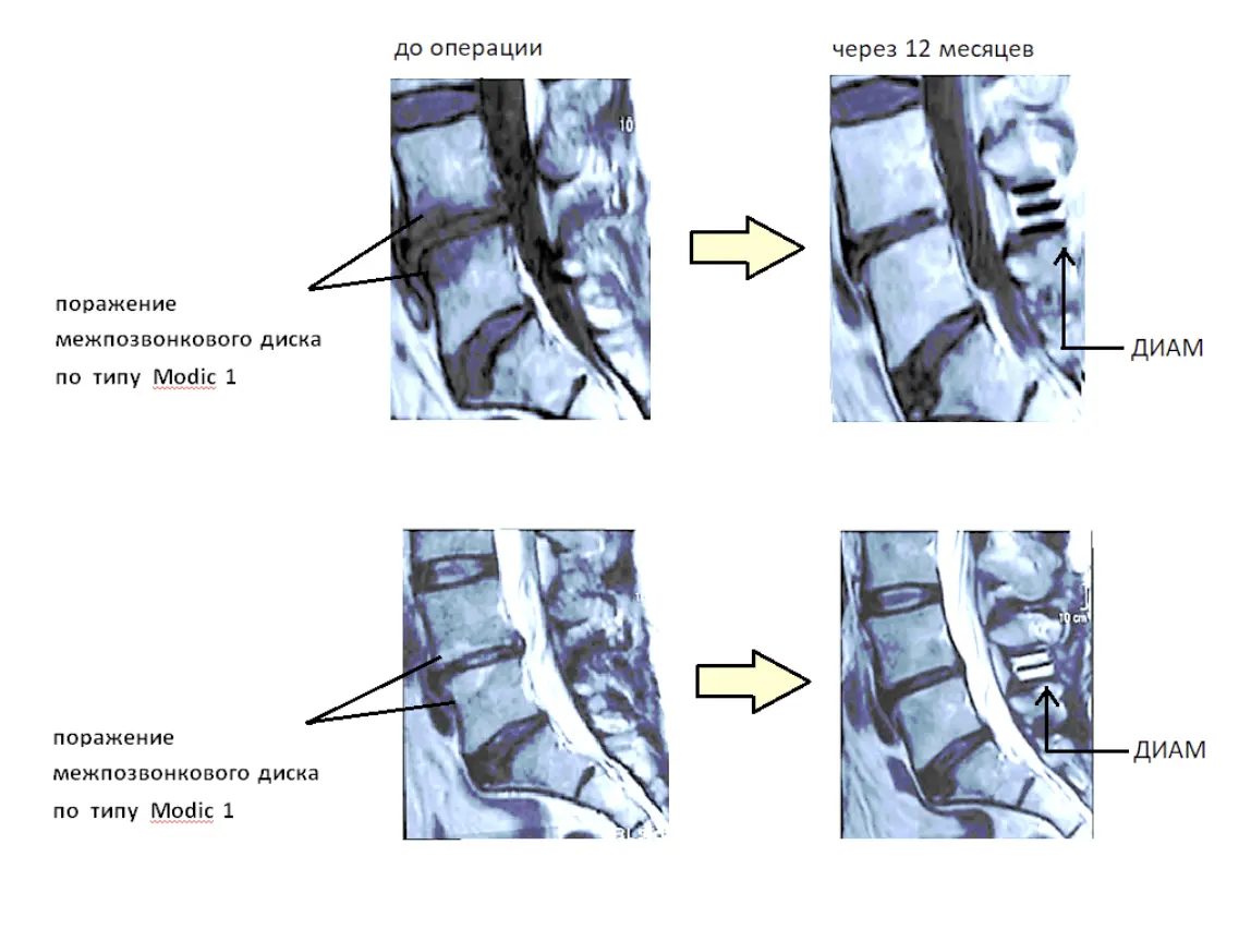 Результаты во многом определяются сроками начала лечения. При своевременных оперативных вмешательствах результат будет лучше. Так по данным зарубежных исследователей у 50% пациентов после оперативного лечения с использованием имплантата Интраспайн дегенеративный процесс остановился; у 30% пациентов наблюдались признаки повторной полной гидратации (восстановления) диска, а у 20% дегенеративный процесс замедлился.